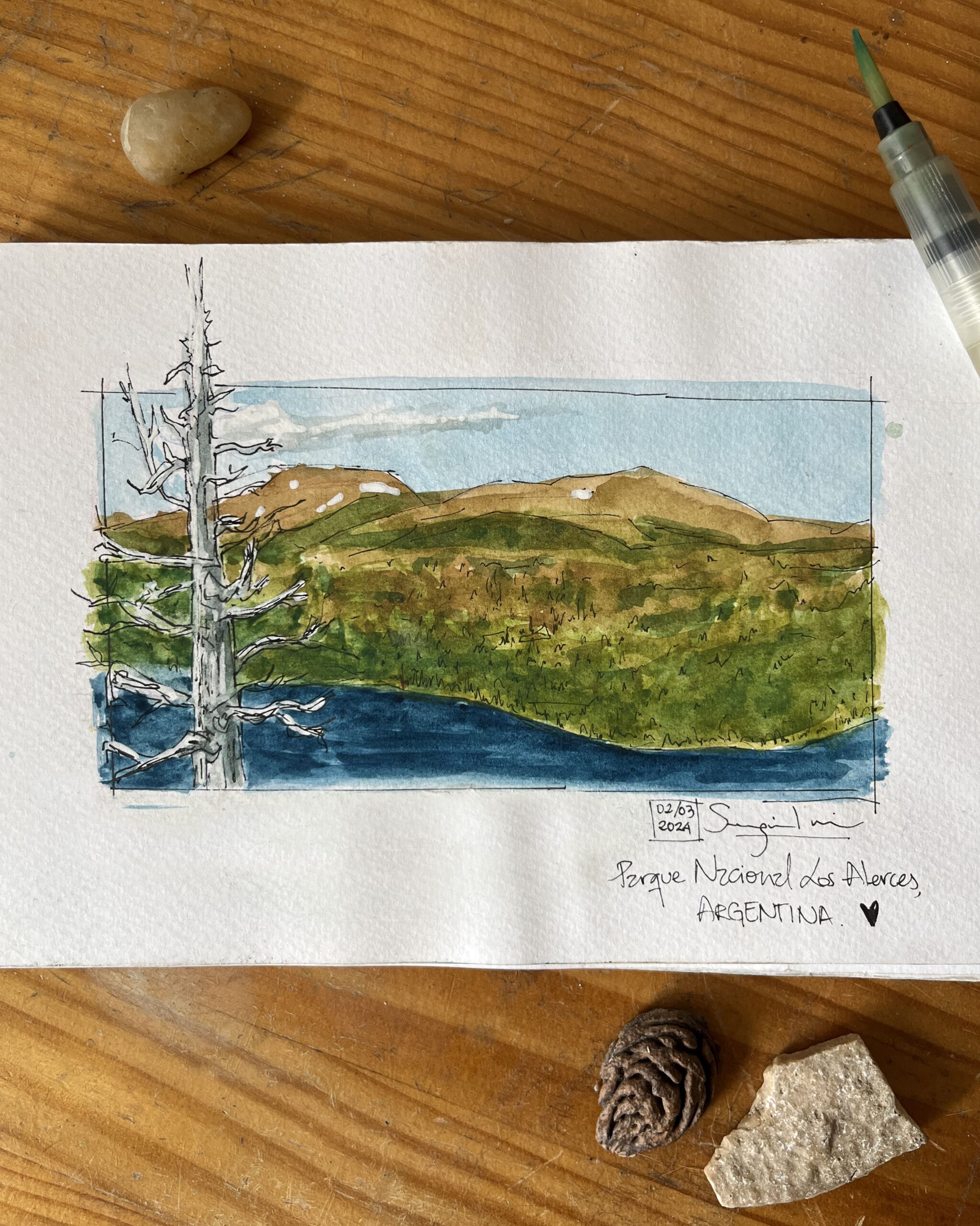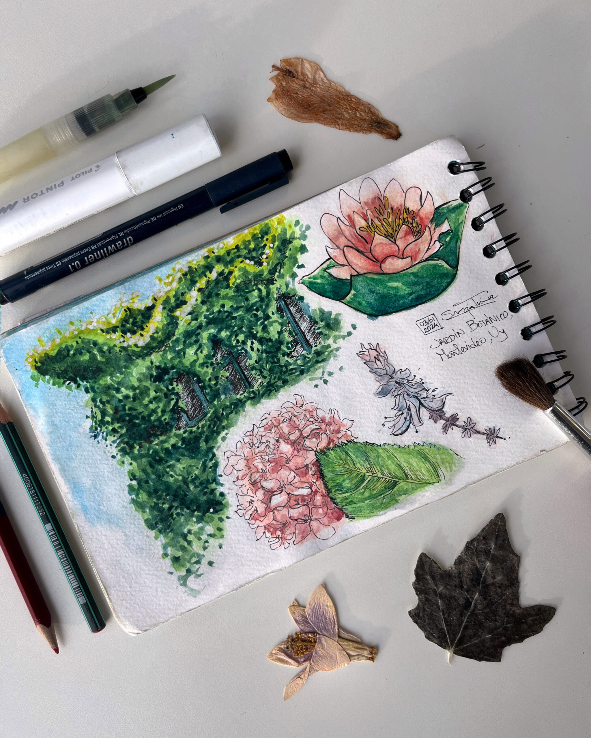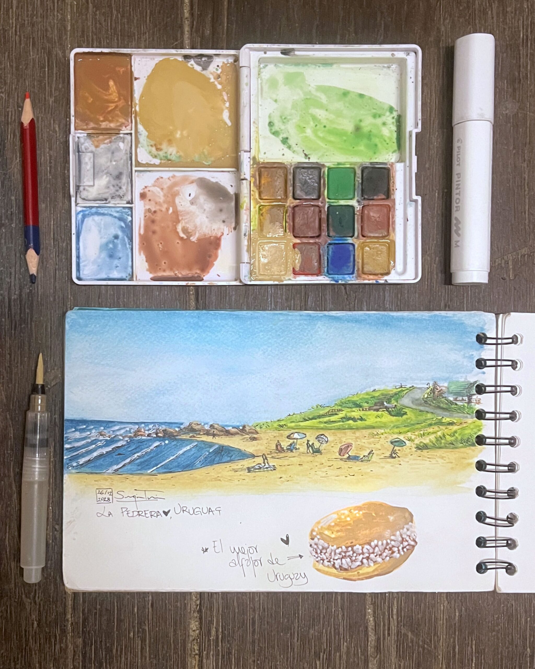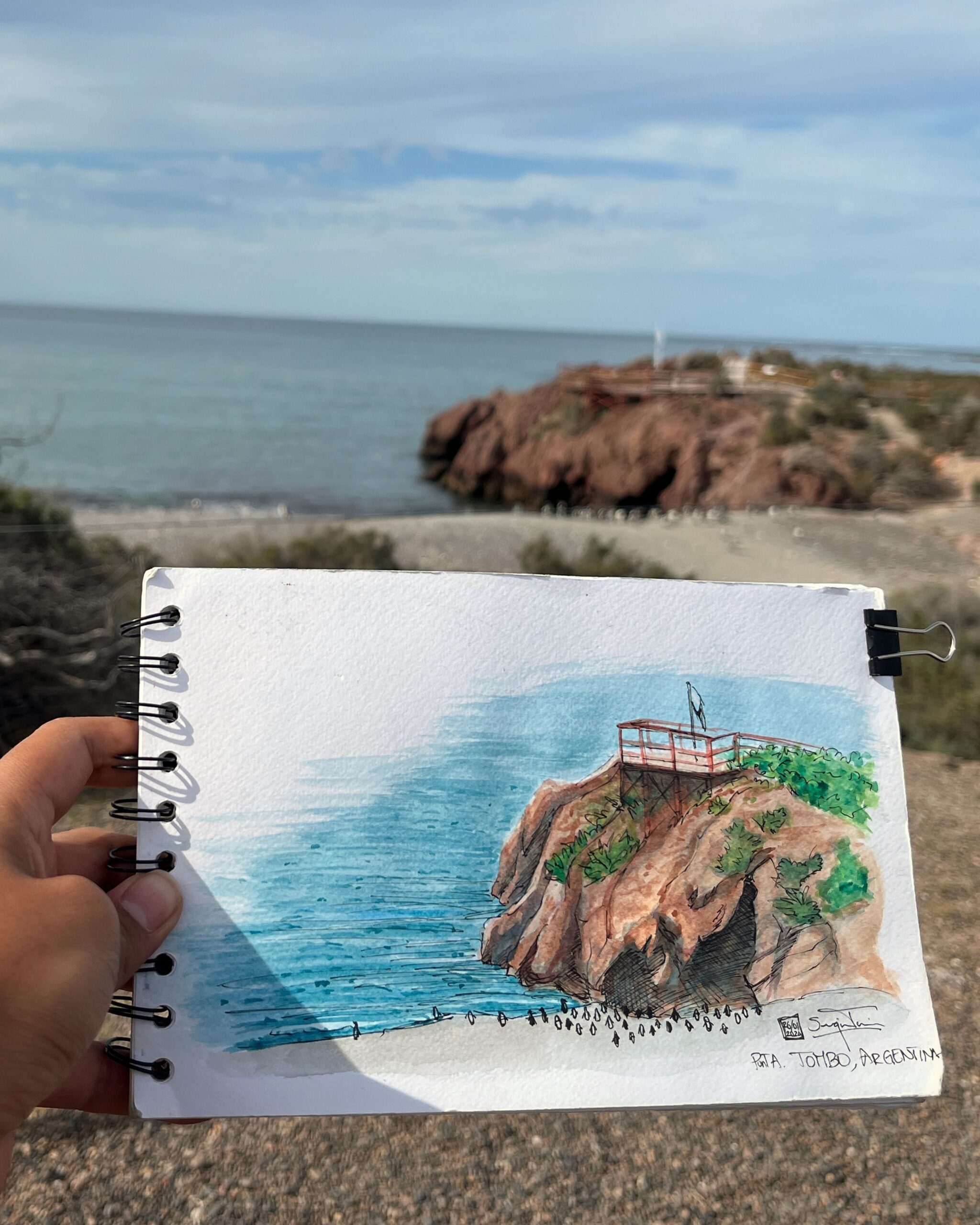 I love traveling and filling my sketchbook with what I see along the way —landscapes, details I come across, or people going about their day. I usually work with watercolor and ink, but I enjoy exploring new techniques too.