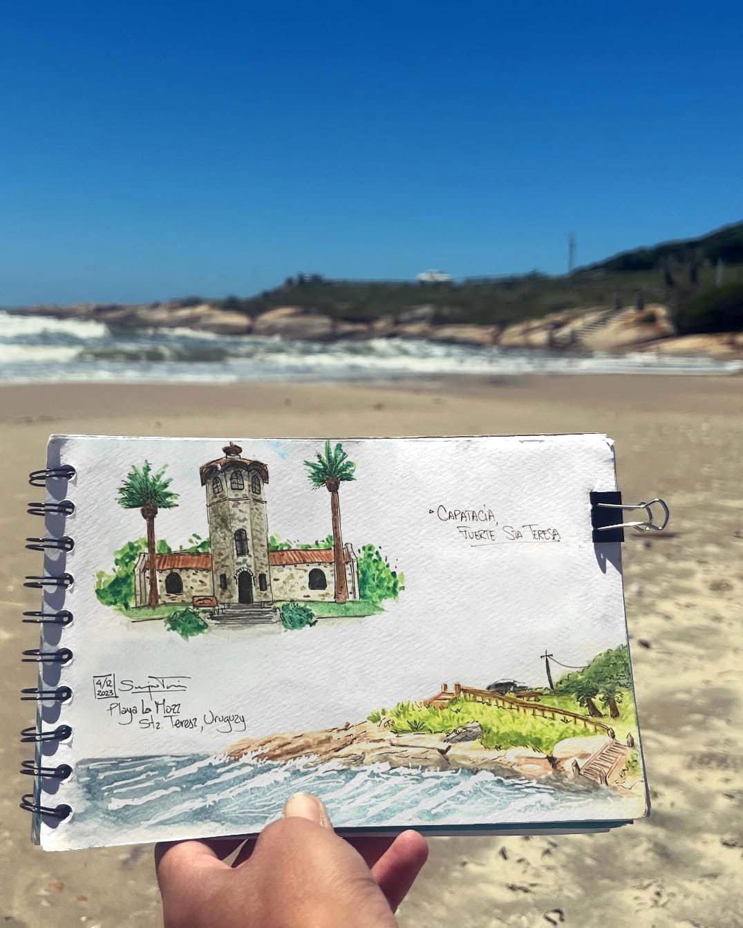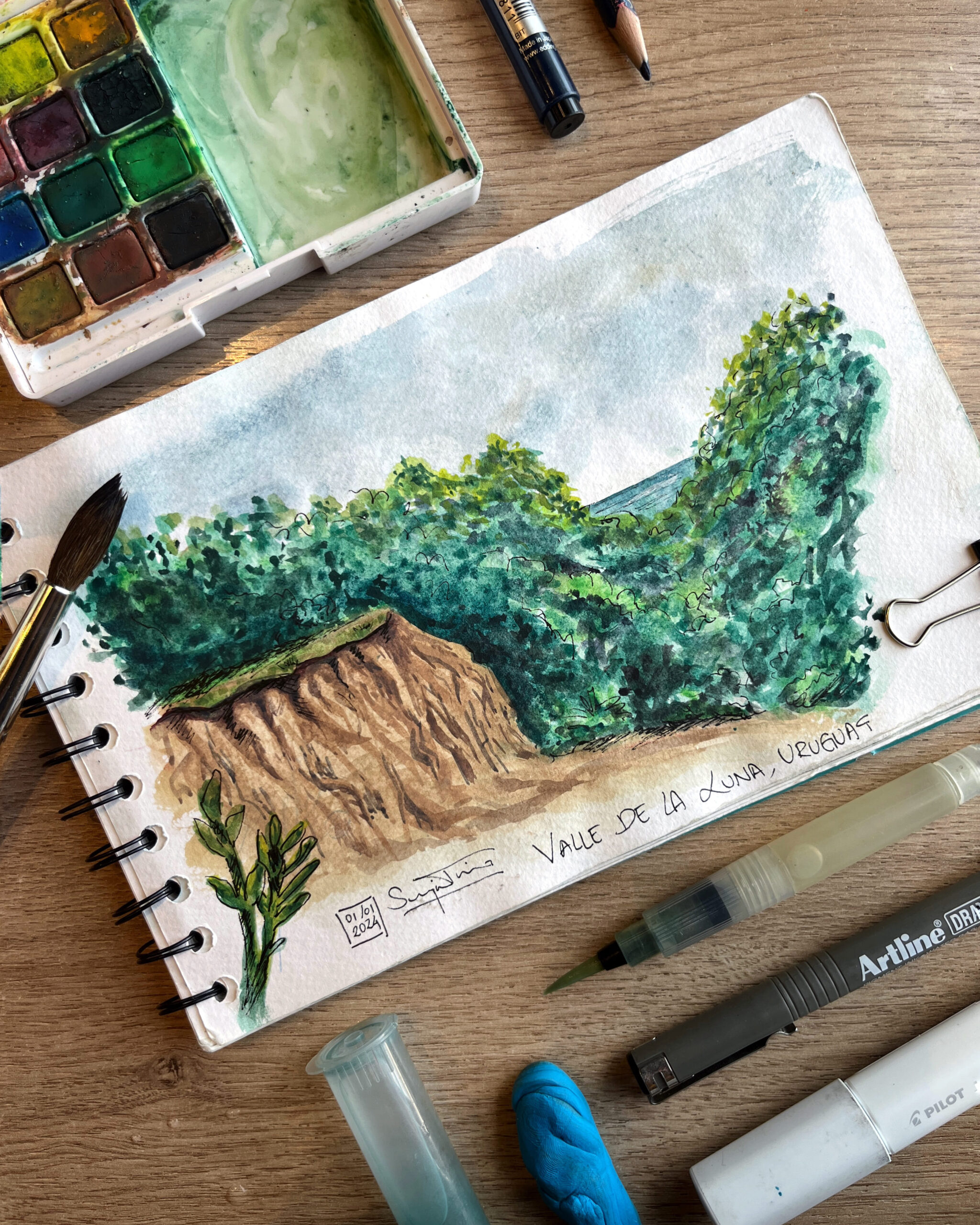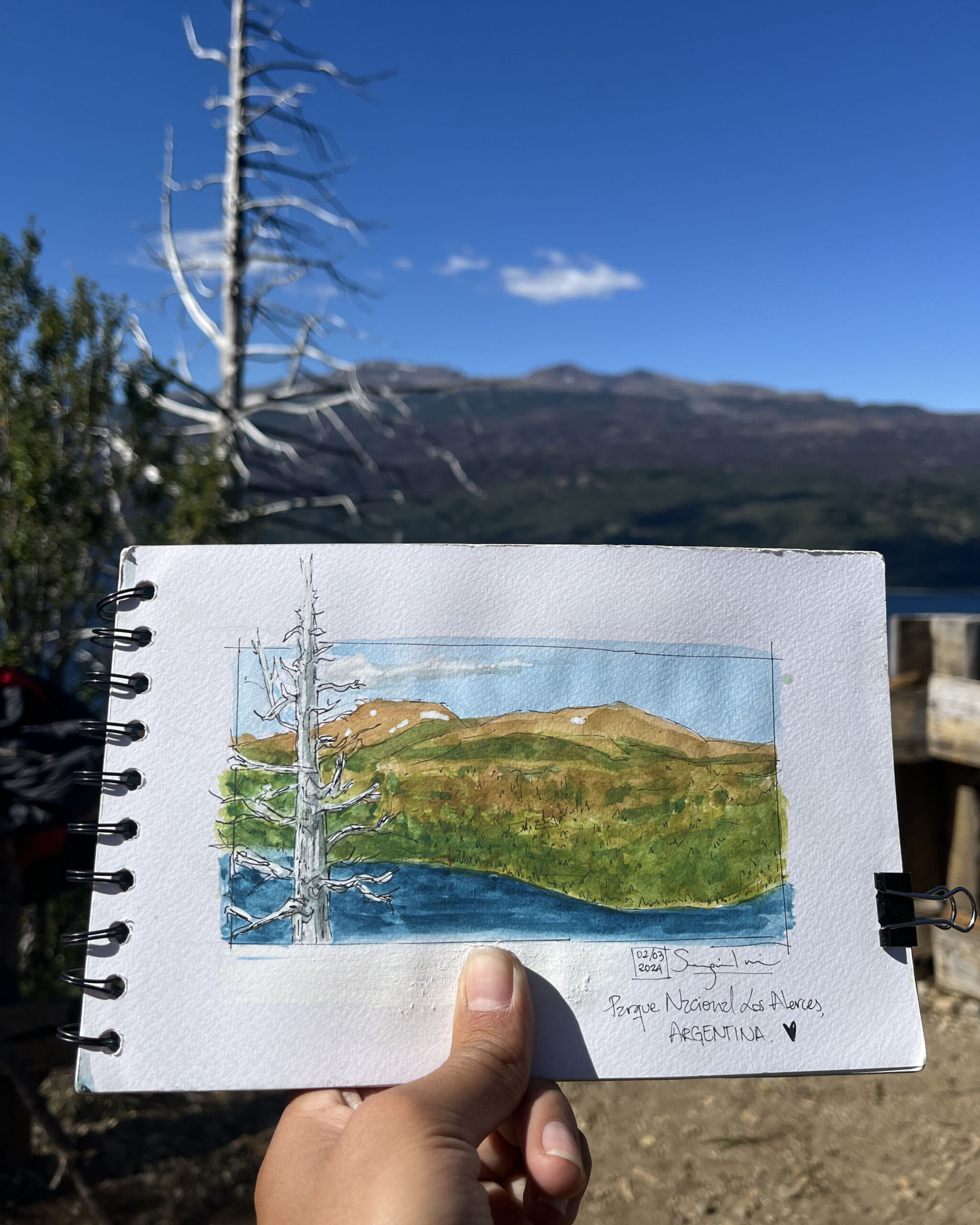 I love traveling and filling my sketchbook with what I see along the way —landscapes, details I come across, or people going about their day. I usually work with watercolor and ink, but I enjoy exploring new techniques too.
